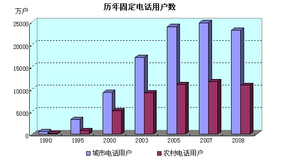 固定电话通信能力明显提高。到2007年底,我国固定长途业务电路达到32.14万个2M;长途自动交换机容量由1978年的0.2万路端增加到1709.2万路端,年均增长36.6%;局用交换机容量达到5.1亿门,年均增长18.1%。2008年全年固定电话用户数达到3.41亿,其中,城市电话用户 2.32亿户,农村电话用户1.09亿户。