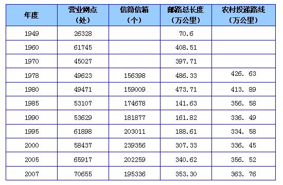 到2007年,我国拥有规模以上邮政营业网点7.1万处,比1978年的邮政局、所增加2.1万处,其中邮政全功能服务的营业网点3.9万处;全国设有邮政局、所的乡镇比重由1978年的68.1%提升到85.5%;邮路总条数达到2.1万条,邮路总长度达到353.3万公里,其中航空邮路达到185.5万公里,铁路邮路达到21.2万公里,汽车邮路达到130.3万公里。