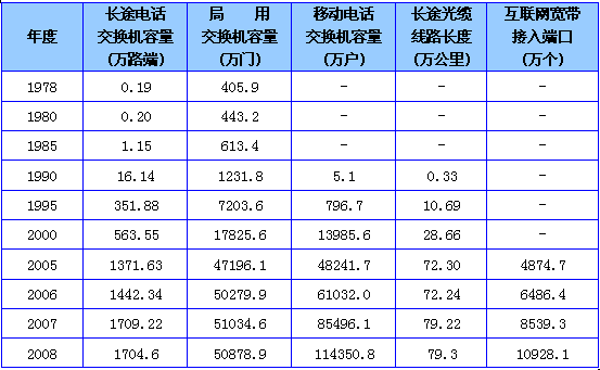 建国60年来,我国综合通信能力从无到有、从少到多,网络规模容量、技术层次、服务水平都实现了跨越式发展。已建成包括光纤、数字微波、卫星、程控交换、移动通信、数据通信等覆盖全国、通达世界的公用电信网。2008年,电信业务总量2.24万亿元,比上年增长21%。电话普及率达到74.3部/百人。