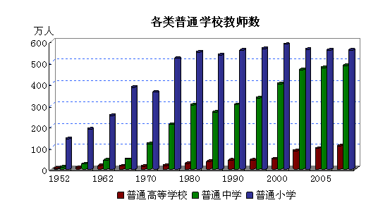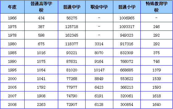 建立了系统的教育机构和专业的教师队伍。建国初,普通高校数仅有201所,教职工仅有7.2万人,严重制约着高素质人才的培养;截止2007年,我国普通高校数已达到1908所,教职工达到116.8万人,为各类专业人才的培养奠定了基础。中小学教育稳步发展,教师队伍素质比建国初大大提高,如今不少研究生也加入了初等教育的行列。