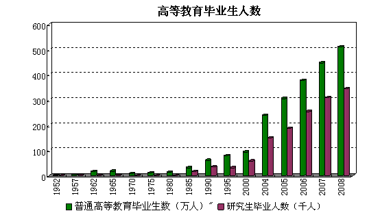 各类毕业生数量大幅增加。1985-2008年高等教育共培养学生3359.3万人,其中研究生208.1万人;1985-2007年职业中学培养2889.9万人,为社会主义建设输送了大量人才。