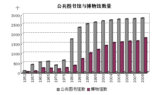 文化从业人员与文化单位数剧增。1995年,文化事业机构数和从业人数分别为58068个和446306人。2007年,文化文物机构数和从业人员达到37.56万个和195.6万人。建国之初公共图书馆与博物馆分别仅有83个、35个,2008年分别达到2825个、1798个。