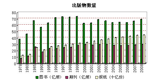 各类出版物大大丰富。2007年,全国出版图书、期刊杂志、报纸的种数分别达248283种、9468种、1938种;而1952年分别仅有13692种、354种、276种;总印数更是成倍地增长,2007年,图书、期刊杂志、报纸的总印数分别达62.9亿册、30.4亿册、438亿份,分别是1952年的7.85倍、14.9倍和26.8倍。2008年,出版图书达到69亿册,各类期刊总30亿册,各类报纸445亿份。