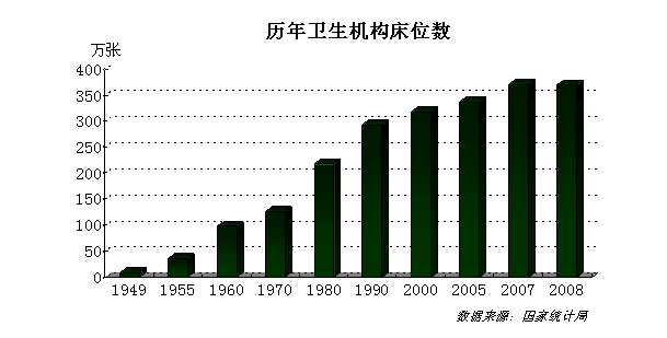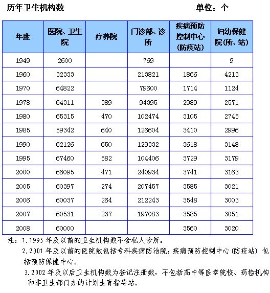 建国时全国卫生机构数仅为3670个,到2007年,我国拥有卫生机构29.8万个,卫生机构床位370.1万张,疾病预防控制中心3585个,医学科学研究机构237个,妇幼保健院3051个。