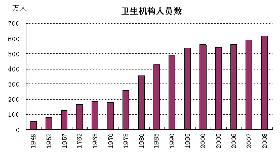 卫生机构人员队伍壮大。1949年卫生机构仅有54万人,2008年增加到492万人。医疗体制改革不断推进,多层次医疗保障体系已具雏形。人口寿命逐渐提升,1990年,全国预期平均寿命为68.55岁,2005年预期寿命达到73岁。