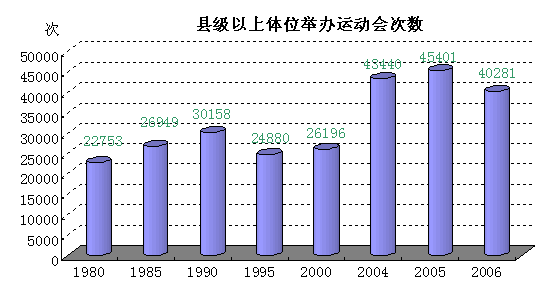 体育活动逐步大众化。在从温饱向小康的历史性跨越中,随着生活水平的提高,人们越来越多地参与到强身健体的体育活动中。1980年县级以上体委举办运动会22753场次,2007年达到49410场次。