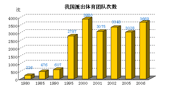 体育对外交往不断扩大。随着我国在国际体坛地位不断提高,体育对外交往日益增多,2007年我国派出体育团队3849次,达24408人,而1980年仅派出体育团队2260次。