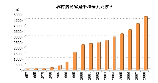 新中国成立以来,我国农业和农村生产力获得了极大解放,农村经济和农业生产取得了很大发展,农业产品极大丰富,告别了农产品短缺的时代。特别是党的十一届三中全会以后,随着农村家庭联产承包责任制在全国的推行,农村居民生活水平大幅提高。农村居民人均纯收入由1978年的134元提高到2007年的4140元,按可比价格计算,消费水平提高6.3倍,年均实际增长7.1%。改革开放后,特别是从1984年我国经济改革的重心从农村转移到城市,国家随之出台了一系列收入分配体制改革的措施,理顺了一些不合理的收入分配关系,城镇居民收入水平有了显著提高,城镇居民人均可支配收入由1978年的343元提高到2007年的13786元,扣除价格因素,实际增长6.5倍,年均增长7.2%。2008年农村居民人均纯收入又比上年增长8%,达到4761元;城镇居民人均可支配收入15781元,比上年实际增长8.4%。