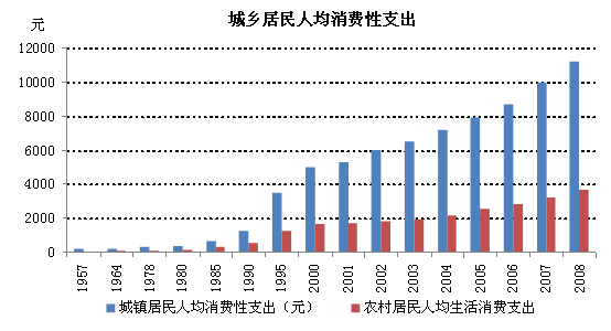 建国60年以来,随着我国经济快速发展和城乡居民收入明显提高,人均消费支出大幅增长,消费水平不断跨上新台阶。城镇居民消费水平由1952年的人均154元提高到2008年的人均11242.9元,农村居民消费水平由1952年的人均65元提高到2008年的人均3660.7元。城乡居民生活水平和质量明显改善。