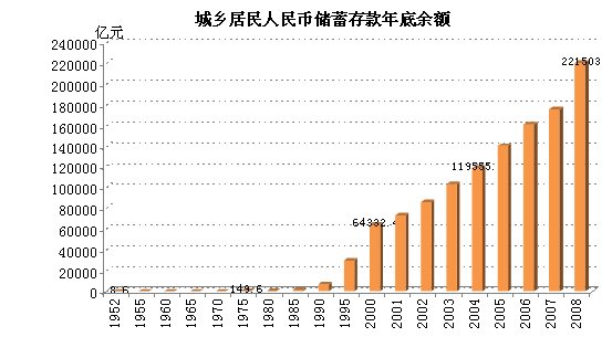 城乡居民拥有的财富呈现快速增长趋势。2008年底城乡居民人民币储蓄存款余额达22.15万亿元,而解放初期的1952年仅有8.6亿元。城镇居民拥有的股票、债券等金融资产规模不断扩大,居民财产性收入占全部收入比重从无到有,上升到2007年的2.3%。