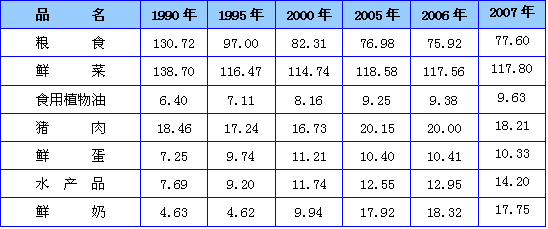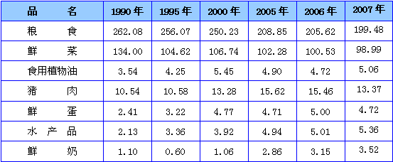 从食品消费结构来看,城乡居民的粮食、蔬菜、食油、食糖消费量逐年下降,肉、蛋、奶、水产品等具有较高质量的消费量逐年增加,食品消费的水平和质量有了较全面的改善。农村居民人均粮食消费量由1978年的248千克降到2007年的199.48千克,城镇居民由1978年的205.3千克降到2007年的77.6千克。从食用的营养角度看,肉、禽、蛋、奶等动物性食品消费量增加,营养结构有所改善。农村居民人均猪肉的消费量由1978年的5.2千克上升到2007年的13.37千克,蛋及其制品由1978年的0.8千克上升为2007年的4.72千克;城镇居民猪肉的消费量由1978年的13.7千克上升到2007年的18.21千克,鲜蛋由1978年的1.97千克上升为2007年的10.33千克。