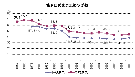 恩格尔系数是国际通用的反映人民生活水平的指标。经过60年的发展,我国城镇居民和农村居民恩格尔系数不断下降,预示我国新一轮的消费结构升级已经来到。2008年我国城镇居民家庭恩格尔系数为37.9%,比1978年的57.5%下降19.6个百分点。农村居民家庭恩格尔系数为43.7%,比1957年的65.7%下降22个百分点。其中,1983年农村居民家庭恩格尔系数首次下降到60%以下,农村居民整体进入温饱生活阶段,到2000年又下降到50%以下,农村居民整体过上了温饱有余的生活,正由温饱向小康迈进。