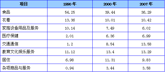 从消费结构的变化看,1954年为基本生存型,消费次序依次是吃、穿、住、用品及其他。其中食品的比重高达69% ;衣着占 13%;居住占9%;用品及其他占9%。到1984年,以农村居民的恩格尔系数降到 60%以下为标志,消费结构序列越过了一个质的界线,农村居民整体生活跨入温饱阶段。吃、穿比重较大幅度下降,居住、文化娱乐用品、服务性支出及其他比重有较多增加。到1990年,农村居民消费支出中排在前三位的依次是:食品58.8%,居住17.3%,衣着7.8%。2000年,排在前三位的是:食品49.13%,居住15.47%,文教娱乐用品及服务11.18%,农村居民生活消费结构序列的逐步优化升级,显示了农民精神生活的日益充实。2007年,排在前三位的分别是:食品43.08%,居住17.8%,交通通讯10.19%,外出旅游成为农村居民新的消费项目,享受性消费支出增加。