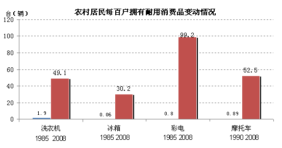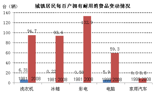 从耐用消费品看,彩电、洗衣机、电冰箱、空调、电话等在城镇中逐步普及,汽车、家用电脑等高档消费品拥有量大幅提高。农村居民彩色电视机、电风扇、洗衣机、摩托车等普及率也不断提高。2008年全国农村居民家庭每百户拥有彩色电视机、电冰箱、洗衣机分别为99.2台、30.2台和49.1台,而1985年仅为0.8台、0.06台和1.9台;2008年全国城镇居民家庭每百户拥有彩色电视机、电冰箱、洗衣机分别为132.9台、93.6台和94.7台,而1981年仅为0.59台、0.22台和6.31台。城镇居民电脑普及率由1999年的5.9台/百户提高到2008年的59.3台/百户,家用汽车普及率由1999年的0.34辆/百户迅速上升,2007年为8.8辆/百户。