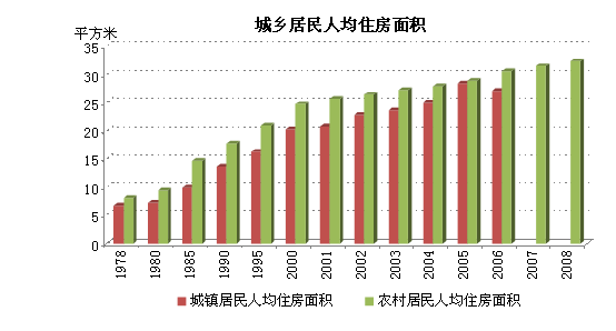 城乡居民的居住面积不断增加,住房条件极大改善。2007年底城镇居民人均住房建筑面积28平方米,比1978年增加21.3平方米;2007年底农村居民人均住房面积31.6平方米,比1978年增加23.5平方米。居住条件的改善更为明显,截止1998年末,有68.3% 的城镇居民家庭住上了单元配套住房,74%的家庭居室内有厕所或浴室,72.6%的家庭使用煤气或液化石油气,41.1%的家庭有可取暖的空调或暖气设备,63.8%的家庭安装了电话。38.1%的家庭住房有全部产权,23.9%的家庭住房有部分产权。2007年,农村居民人均居住支出573.8元,比1978年的12元高出46.8倍。平均每户年末使用住房面积由1978年的8.1平方米增加到2007年的31.6平方米,增长2.9倍。人均住房面积上,2007年砖木结构和钢筋混泥土结构住房面积比重达到86.4%,比1981年的 48.6%提高37.8个百分点。
