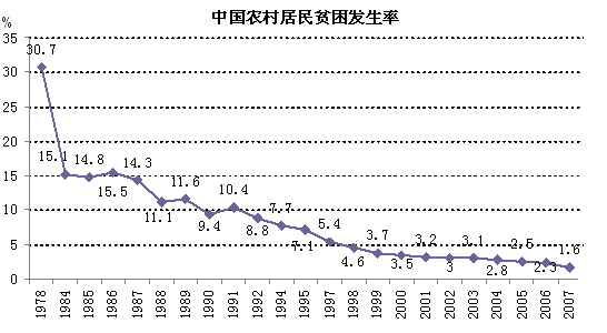 扶贫工作取得巨大成绩。改革开放之初的1978年,全国农村绝对贫困人口约有2.5亿人,约占全部人口的四分之一。建国60年来,我国在缓解贫困方面取得了巨大进展,农村居民生活从普遍贫困到整体解决了温饱。到2007年,农村绝对贫困人口减少为1479万人,不足全部人口的2%,比1978年减少2.3亿多人。世界银行认为,在消灭贫困方面,中国政府做出了巨大的努力,近25年来,全人类取得的扶贫事业成就中,三分之二的成就应归功于中国,是发展中国家的典范。