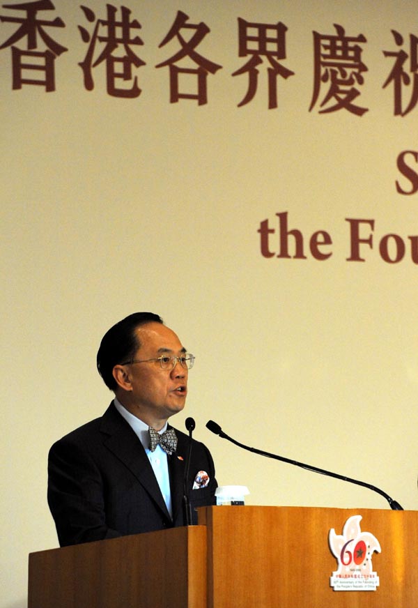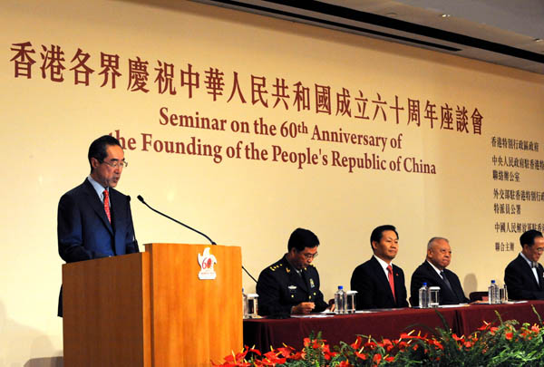 香港特别行政区行政长官曾荫权在致词中说,60年来,香港与祖国休戚与共。国家一直关心香港,即使在最困难的年代,国家也没有中断对香港的食品供应,更解决了香港的饮水供应问题。香港回归祖国后,国家对香港的支持更为全面。无论是亚洲金融危机、2003年“非典”的肆虐,以至去年金融海啸,国家都给予香港有力的支持,通过个人游、CEPA等优惠政策,帮助香港克服危机,使香港进一步繁荣。改革开放以来,香港对国家的快速发展,也贡献良多。在新中国成立60周年的新起点上,国家正迈向新的阶段。香港一定会为国家的发展,做出更多的贡献。