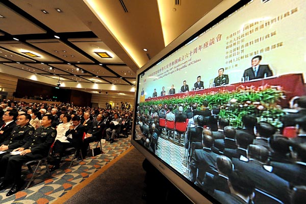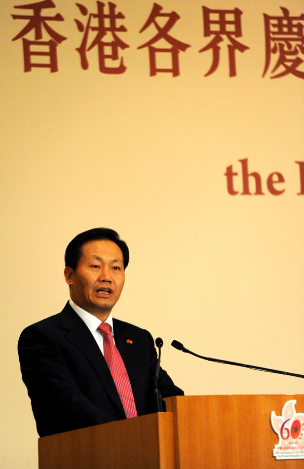 中联办主任彭清华在致词中表示,新中国的60年,也是香港与祖国血脉相连、休戚与共的60年。在共和国光荣的旗帜上,记载着香港同胞的杰出贡献。新中国成立之初,西方国家对新中国实行全面封锁,是香港为祖国打开通道,输送了大量急需物资。改革开放以来,香港为内地输入了大量的资金、技术、人才以及成熟的市场经验和管理经验。他说,“一国两制”的伟大创举,是中华民族对人类政治文明的独特贡献,“一国两制”的成功实践,是香港长期繁荣稳定的可靠保证。