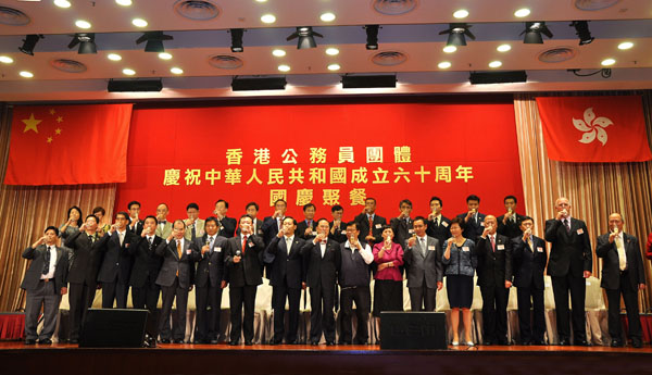 本网讯 9月23日,中联办主任彭清华应邀出席香港公务员团体在龙堡国际宾馆举办的庆祝中华人民共和国成立60周年聚餐活动,与香港特区行政长官曾荫权共同主礼活动。