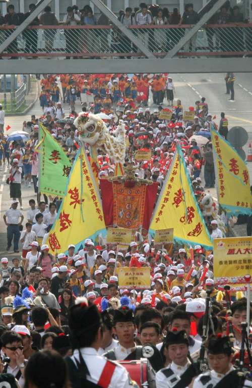 昨日最高气温有摄氏三十一度,大热天时依然无减过万名青少年走上街的热情,更有家长带同只有几岁的小朋友参与巡游,为的是一同庆祝祖国六十华诞这个别具意义的日子。