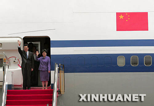 这是胡锦涛主席和夫人向欢迎的人群挥手致意。 新华社记者周磊摄